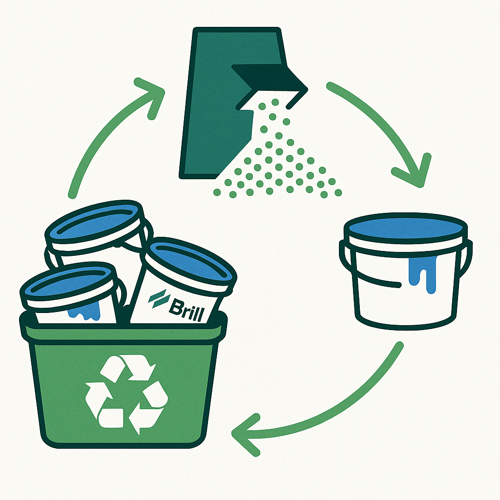 Leere Gebinde wie Farbeimer werden über das Brillux-Recyclingsystem gesammelt und wiederverwertet – ein aktiver Beitrag zur Kreislaufwirtschaft. -